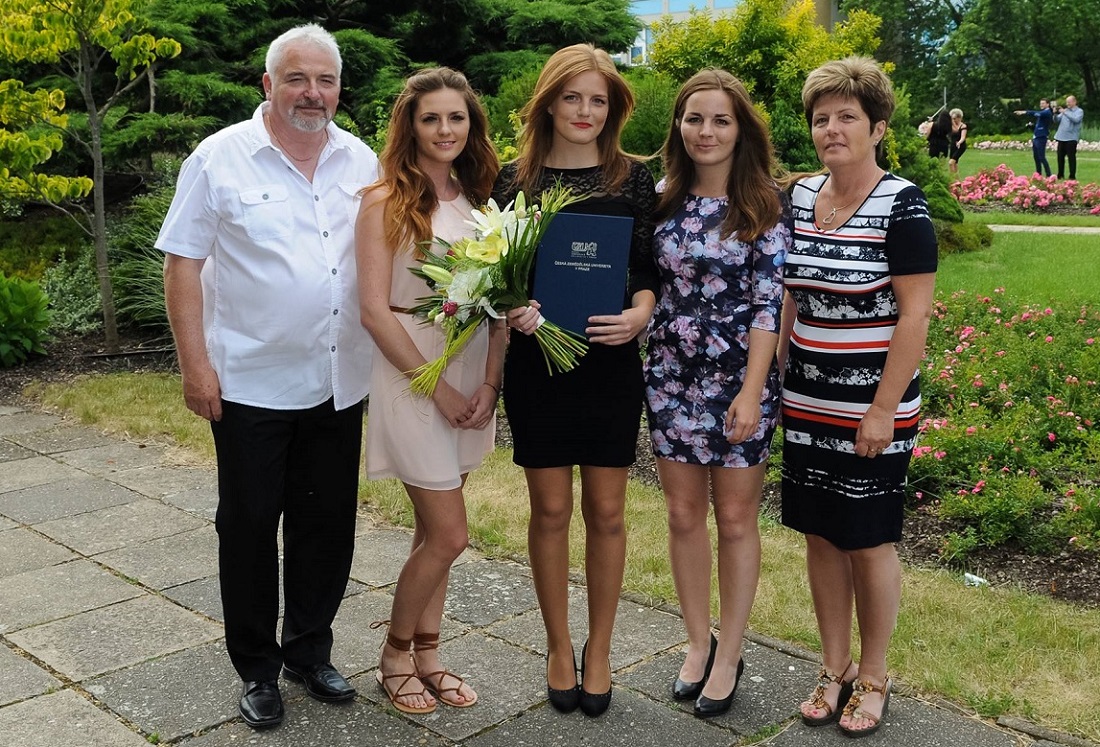 RODINA s Andreou Henclovou, která v roce 2019 ukončila studium na Ekonomické fakultě České zemědělské univerzity v Praze a získala titul inženýrky. Zleva: tatínek Vladimír, Markéta, Andrea, Nela a maminka Romana