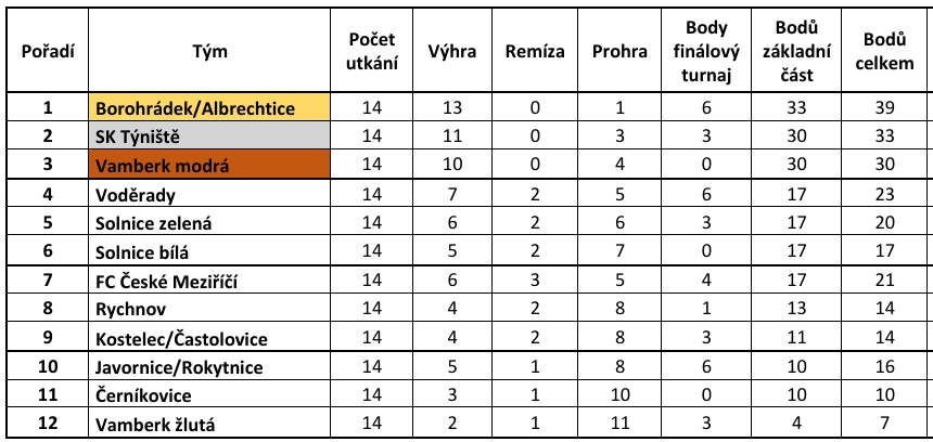 STARŠÍ PŘÍPRAVKY – U11: 1. místo - Borohrádek/Albrechtice (v zeleném), 2. místo - SK Týniště (v bílém), 3. místo - Baník Vamberk modrá (v modrém)