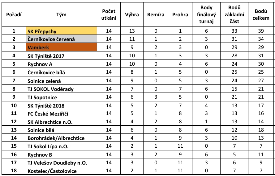 MLADŠÍ PŘÍPRAVKY – U9: 1. místo - SK Přepychy (v bílém), 2. místo - Sokol Černíkovice červená (v červeném) a 3. místo - Baník Vamberk (v modrém)