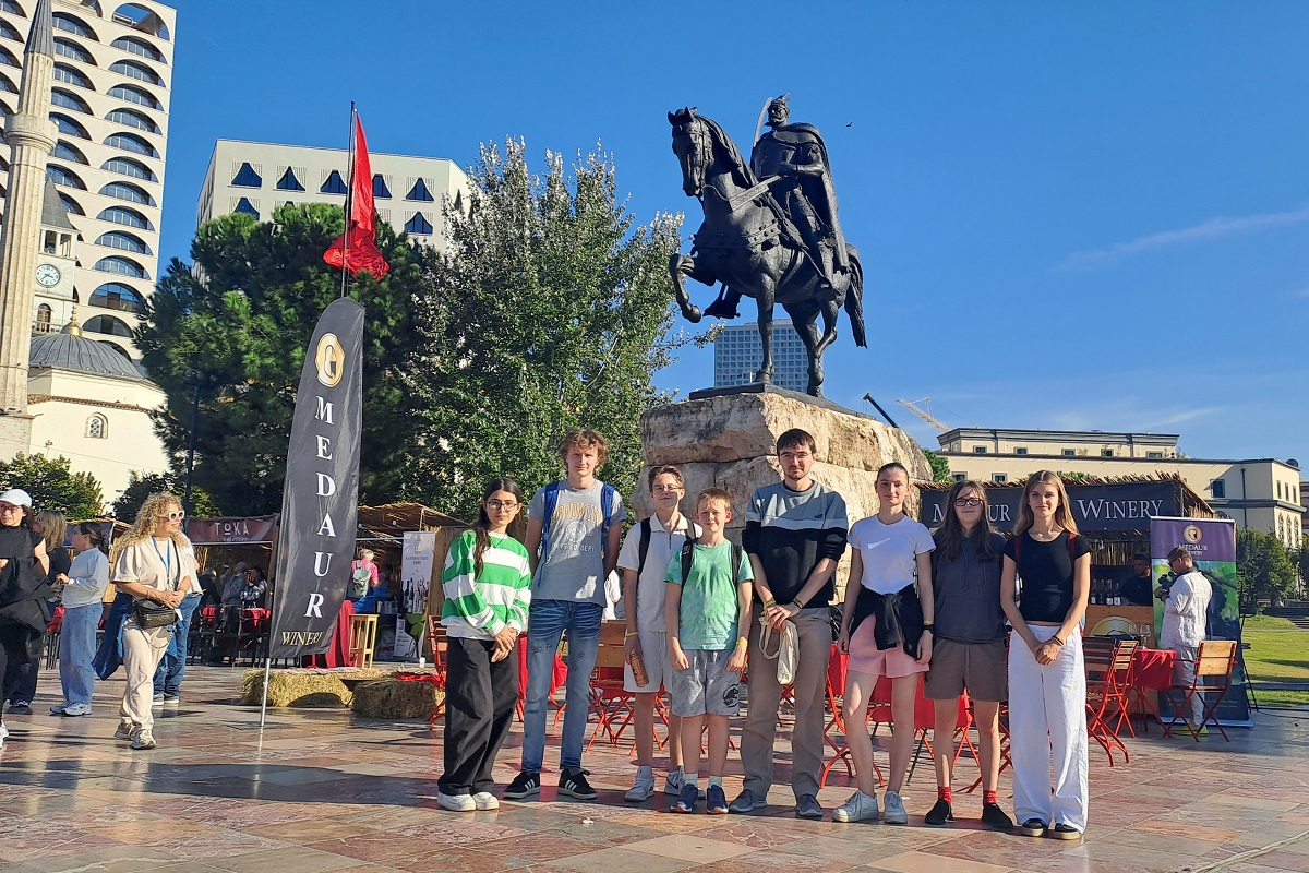 ČESKÁ VÝPRAVA všech kategorií u albánského vojevůdce Skanderbega, národního hrdiny a přední postavy albánských dějin. Vašek čtvrtý zleva