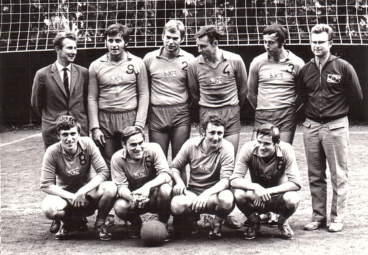 VOLEJBALISTÉ Auto Kvasiny 1971, horní řada: Novotný, Dittrich, Dostál, Žabokrtský, Píč a trenér Vavera. Dole: Franc, Matuška, Daníček a Martinec