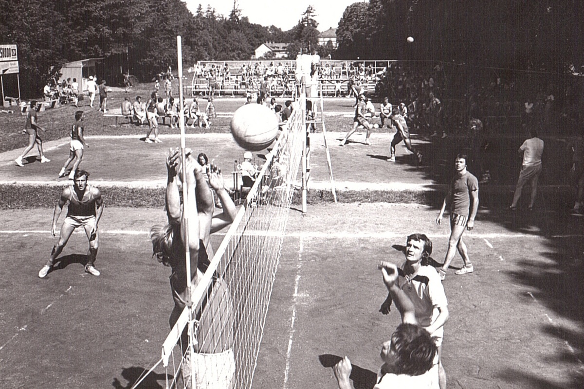 LETNÍ volejbalový turnaj v Kvasinách, psal se rok 1976. Vlevo na prvním hřišti v poli Zdeněk Žabokrtský a na síti blokař Jaroslav Dostál