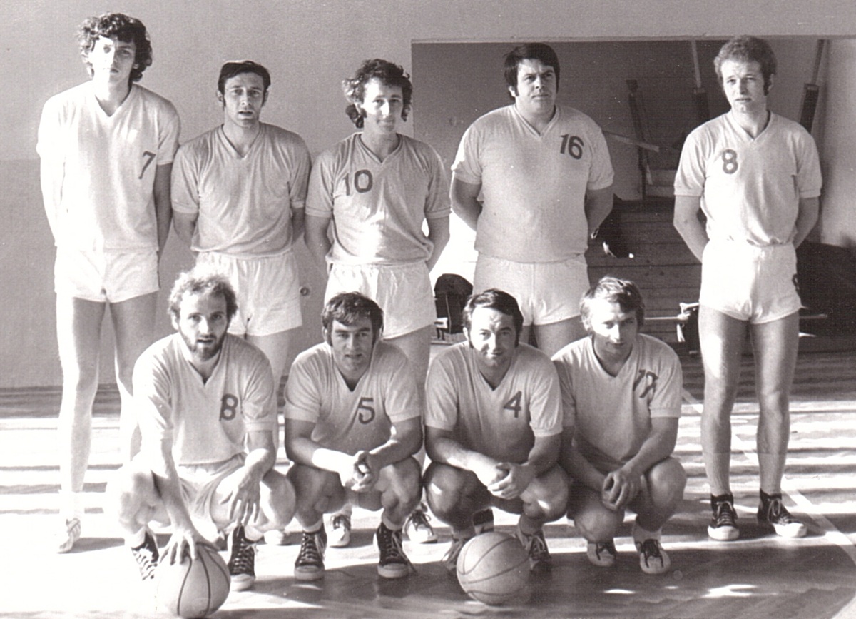 BASKETBALISTÉ Spartaku Rychnov 1975, horní řada: Doleček, Žabokrtský, Daníček, Horyna a Felix. Dole: Derunov, Šeda, Čech a Petrů