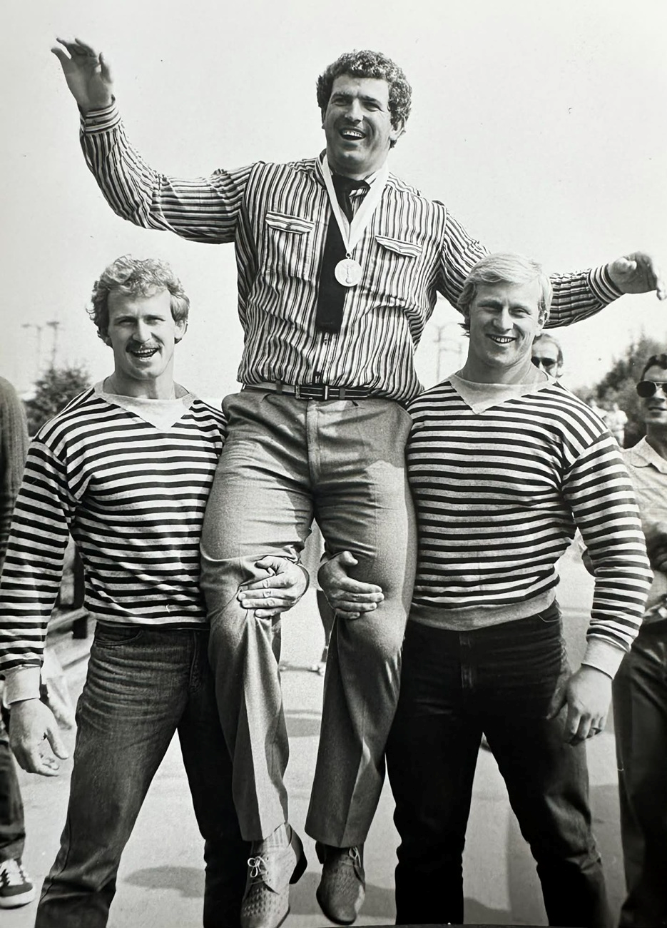 MISTR SVĚTA Imrich Bugár na ramenou rychnovských bratří Martina a Remigia Machurových po úspěšném mistrovství světa v Helsinkách v roce 1983. Martin zde reprezentoval Českolovensko v desetiboji, bratr Remigius ve vrhu koulí získal bronzovou medaili