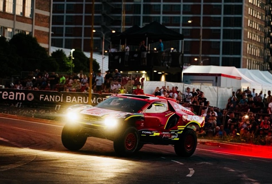 BARUM Rallye o celkové délce 207,49 km měla slavnostní start před večerní diváckou kulisou, kterou zpestřil Martin Prokop se svým speciálem Fordem Raptor T1+ a fanoušci? Šíleli: „Boží bestie! Ten zvuk, jak si to dával na centimetry okolo balíků! Klobouček!“ Foto - Archív Martin Prokop