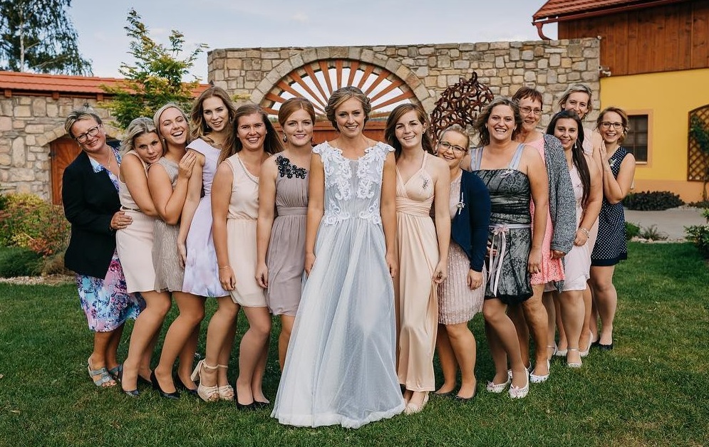 SVATBA v Hejtmánkovicích – září 2018. Nevěsta Dáša s kamarádkami z národní házené, Andrea Henclová po pravé ruce, Petra Vošlajerová pátá zprava